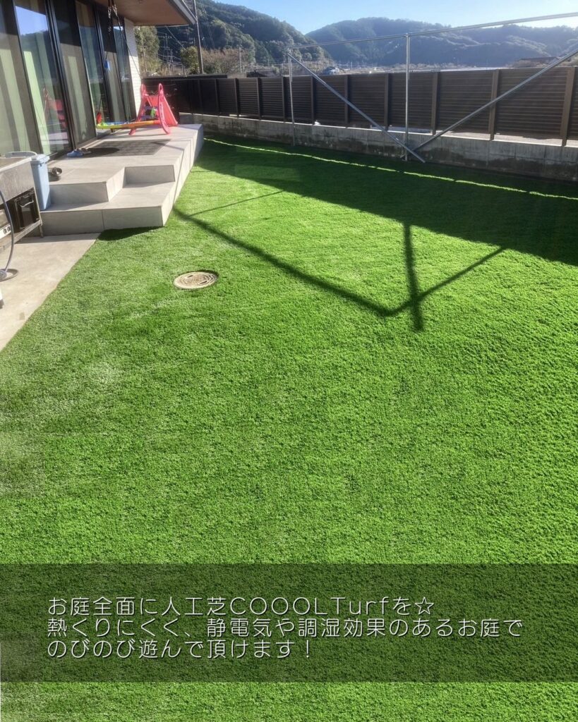 お子様が安心して思いきり遊べるお庭づくりのため、庭全面に人工芝「COOOLTurf」を施工いたしました。